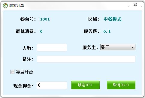 ◆ 开餐台,选择本次服务的专属服务生,点击确定开台